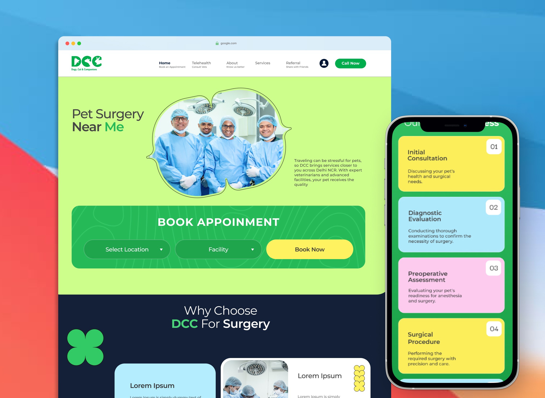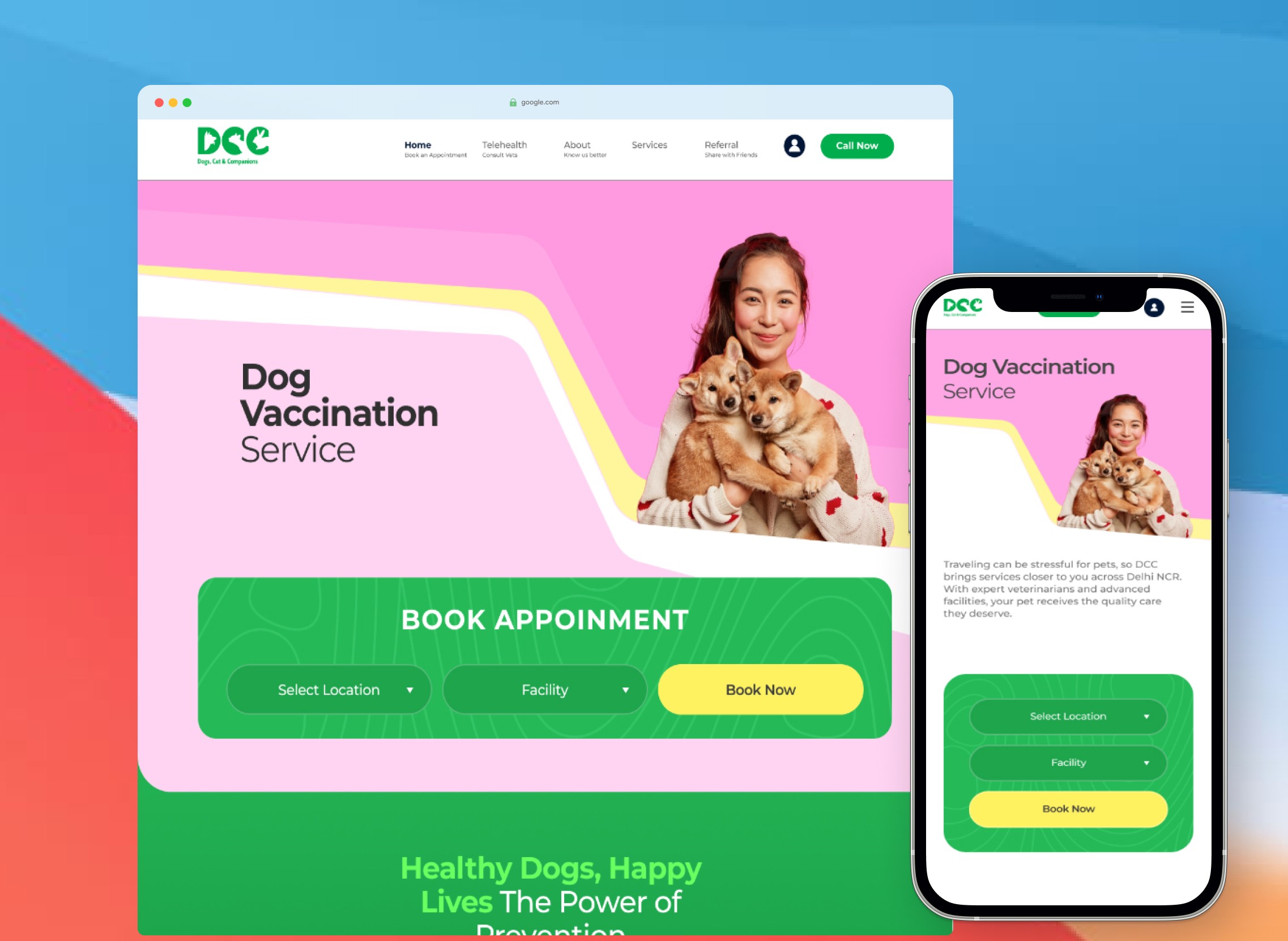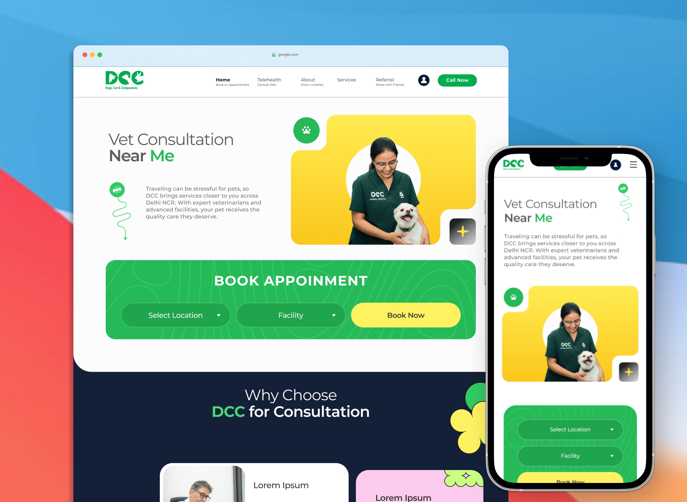 DCC Pets is a leading pet healthcare brand offering veterinary care, diagnostics, pet grooming, boarding, and more. The goal was to redesign the website to improve appointment booking and user engagement and communicate DCC’s premium care philosophy.