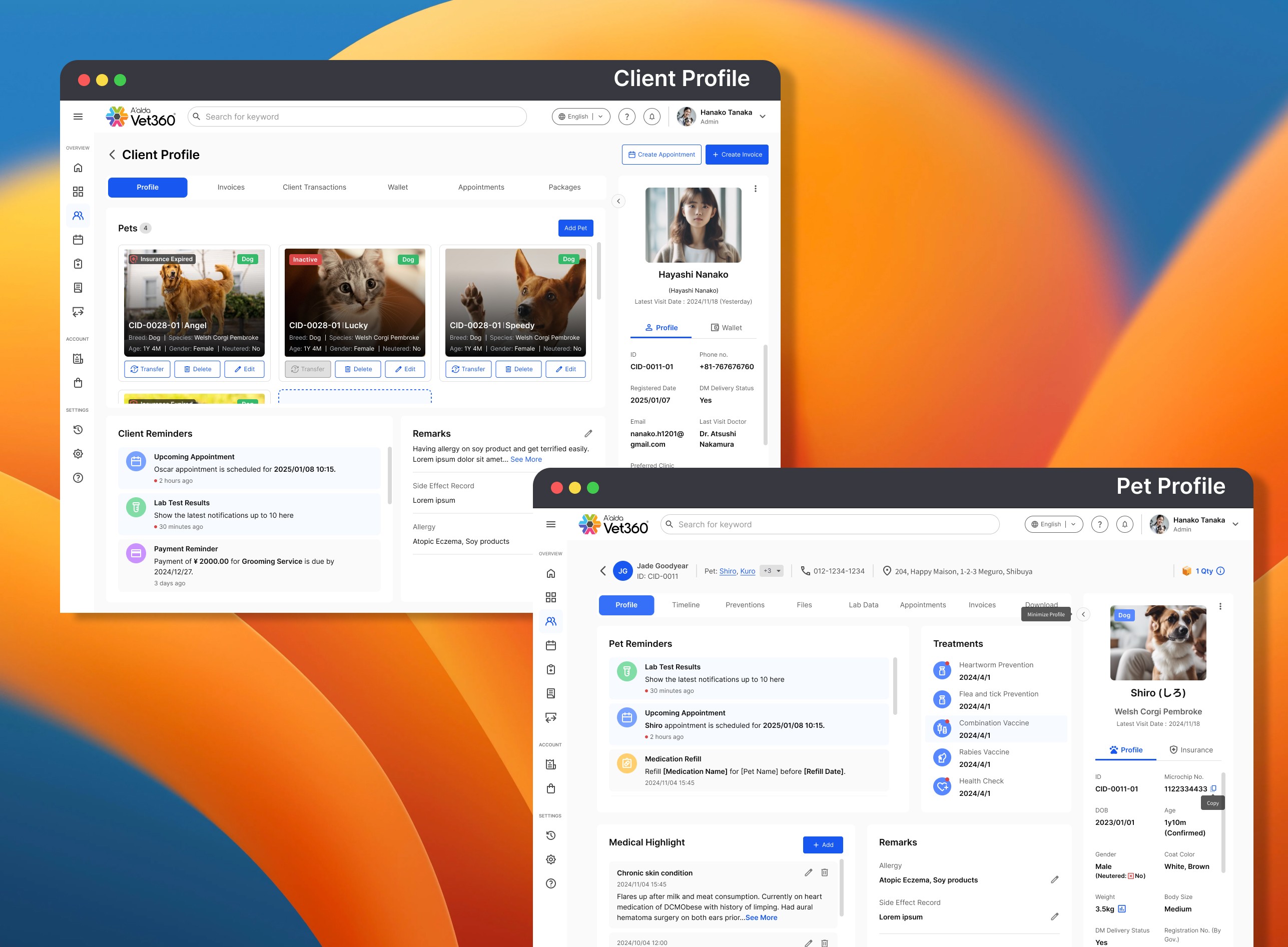 Easy global search and pet and client selection from the header